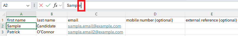In the below example, the Last Name field cannot include the full stop character, as such "S.ample" as a last name is invalid and will need to be changed before proceeding.