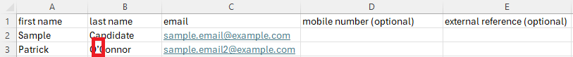 If you are uploading your candidate file but received the following error message, please check through the table below. The issue will be due to specific rows in the file containing characters that are not recognised by the upload feature.