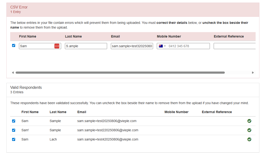 ![]() Example of CSV Error which can occur, with examples of valid respondents. |